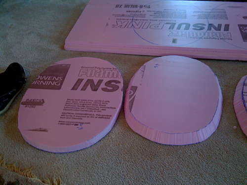 Corte la tabla en óvalos o círculos, o cualquiera que sea la forma de su cabeza de la mascota. Hay muchas maneras para cortar el tablero como navaja, Sierra caladora, y Sierra de calar. Cualquier tipo de sierra hace un lío. La manera más fácil, más limpia y más rápida es con un cuchillo caliente. La tienda compró cuchillos calientes son costosos y endebles. Hice mi propia siguiendo las instrucciones en instructables (caliente-cuchillo-de-plástico-corte!). En lugar de martilleo la punta, me compró un tornillo de cobre amarillo largo de tres pulgadas y martillado/archivado lo plano. Trabajó muy bien. Como cortar las capas de tratan de que la forma áspera de la cabeza. IMPORTANTE si la pieza es demasiado grande es fácil de hacer más pequeño, si la pieza es muy pequeña es muy difícil hacerlo más grande. Cuando usted corta las primeras piezas, hacen más grande que crees que necesitas. Otro Consejo es numerar las piezas, etiqueta de la parte superior e inferior. Así es fácil de poner juntos nuevamente en el orden correcto.