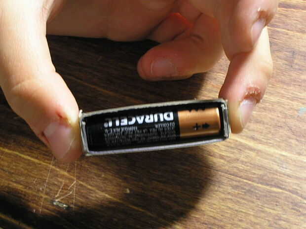 esta es la segunda versión de mi soporte de la batería. Este soporte es para aquellos que gustan de un buen ajuste. De hecho es tan apretado, que necesitarás algo que saque la batería muerta. Eso es si medir demasiado pequeño y no permite suficiente espacio para la batería. Este titular también tiene pestañas más fuertes y utiliza menos papel de aluminio. Pero se usa cartón más así que espero que tengas suficiente cartón. El secreto de la estrechez de este soporte es el cartón que viene alrededor de los extremos.