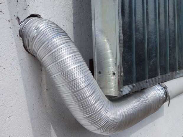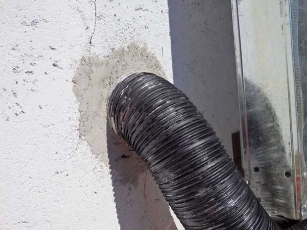 - Alimentar el secador dos respiraderos en los agujeros en la pared. Secadora ventilación es como acordeones, así que les pueden tirar aparte o empuje para cambiar la longitud. Desea la ventilación inferior a ras con la parte interna de la pared, y la rejilla de ventilación superior quiere venir a la parte biselada hacia fuera para el ventilador.