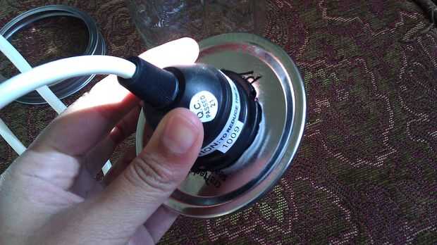 en primer lugar, afloje el fijador cosita del la toma y desenrosque la tapa de la jarra. Luego, pegar la toma a través del agujero en la tapa y el tornillo en el fijador cosita al otro lado de la tapa que sostiene la toma en su lugar. Como aprieta en usted puede ajustar la colocación.