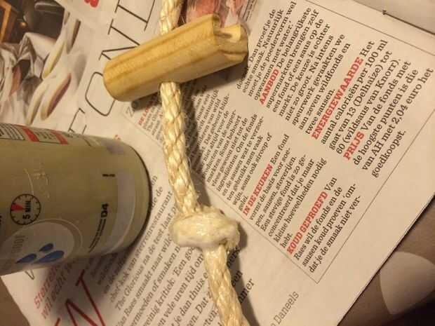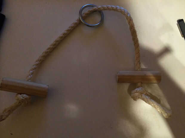 Luego puede hace un nudo en un extremo y reforzar con pegamento de madera. Empujar uno de los pedazos de madera sobre él luego de la de los anillos de metal. Entonces empujar la otra pieza de madera de la cuerda y hacer otro nudo y otra vez fortalecerlo con pegamento de madera. Puede ver las imágenes para obtener más información cómo debe parecerse.