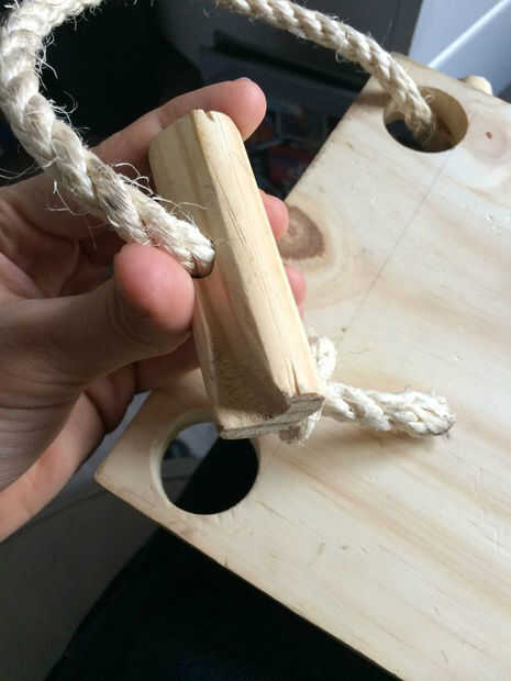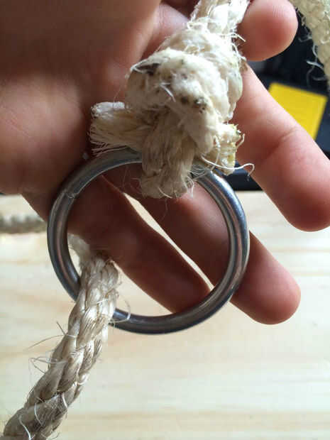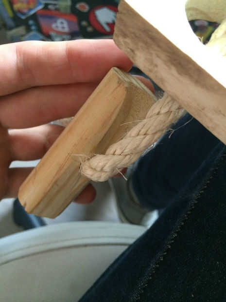 Cuando tengas las piezas de conexión, que sólo tienes que ponerlas a través de uno de los agujeros en la tabla y a un lado hacer un nudo con la cuerda que está conectada en el anillo de metal, otra vez reforzarlo con algún pegamento de madera, el otro anillo deje solo. De lo contrario se puede ajustar la longitud de la misma.
