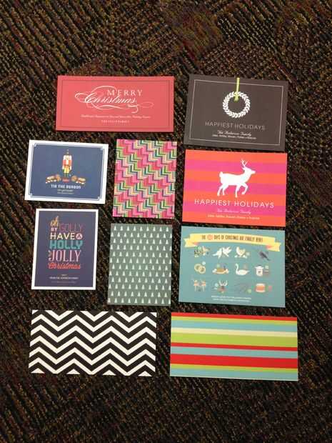 En movimiento. Paso 1 es reunir a todas tus tarjetas de Navidad o invitaciones. Escoger tus favoritos o los más coloridos/interesante para mirar. Para este proyecto usé unas 123Print vacaciones tarjetas e invitaciones de mi propia colección. Si cualquiera de tus tarjetas tiene diseños frescos en la parte posterior como mina, puede utilizar para un retroceso adicional de color! Recomiendo usar 10 tarjetas de diferentes tamaños y estilos.