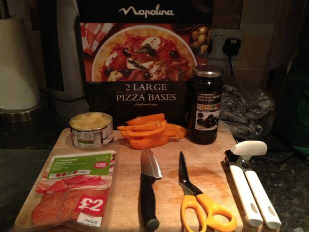 •Scissors •Knife •Pepperoni •tomato salsa (pasta tipo funciona bien) • dos pizzas llano •orange pimientos • piña • puede abridor •Cheddar o mozzarella queso. (O en mi caso ambos. Cuando tengas todo esto listo se mueven en el siguiente paso.