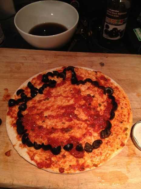 Puede quiero una imagen con usted para esto o simplemente hacerlo de memoria como lo hice. agarra todas las aceitunas en cuartos y comienzan a colocarlos en la pizza hasta llegar a un esquema como el mío.