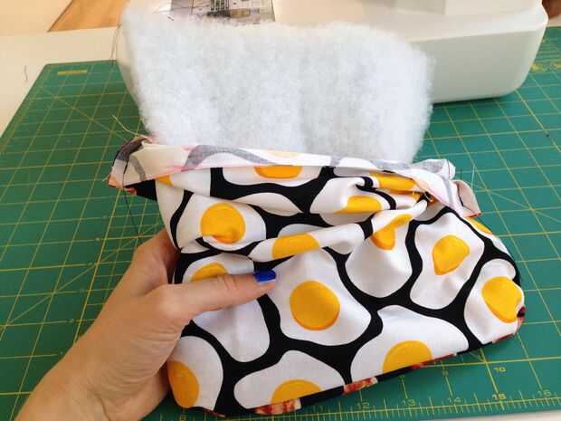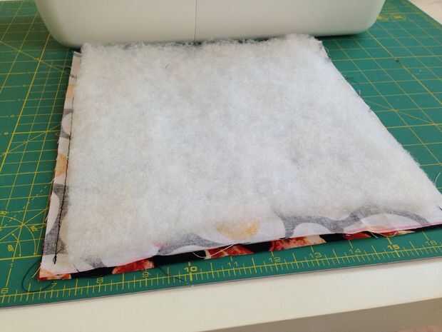 Podría sólo voltear a la tela de adentro hacia fuera primero y luego añadir el bateo, pero me parece que colocar la guata en primer lugar ayuda a permanecer en el lugar. Lo importante es que se llena todo el espacio interior y que el bateo toca todas las costuras y esquinas. Si no tienes protuberancias extrañas o valles con el tiempo.