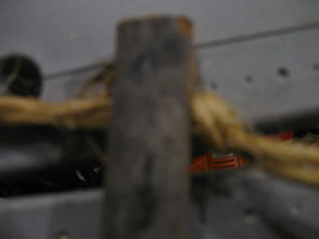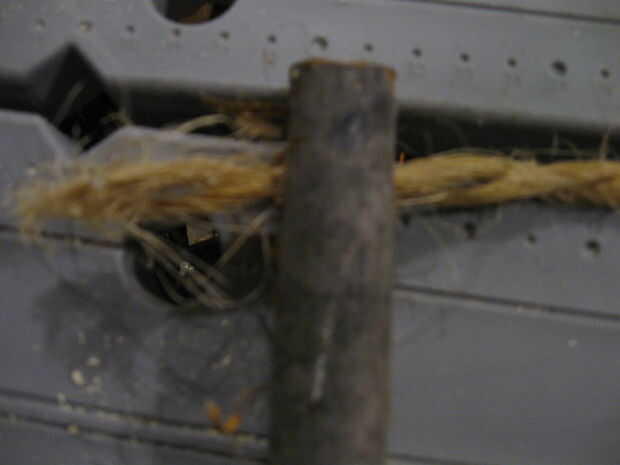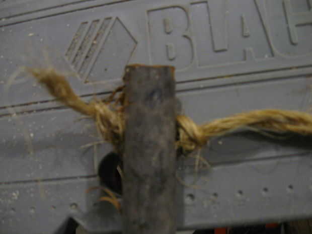 ahora es el momento para poner la cuerda a través de. En primer lugar hacer un nudo aproximadamente 2 pulgadas desde el extremo de la cuerda. Luego deslice la palanca y el resto de la cuerda para formar otro nudo para que no se salga la barra de lazo. Repita para el otro lado.