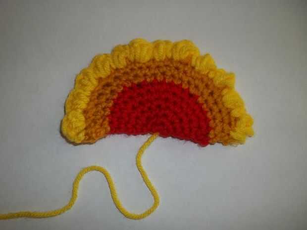 Cambiar a color amarillo. Doblar el círculo por la mitad. Para el resto de esta parte necesita empujar el gancho a través de ambos lados. Empiece en uno de medio círculo y hacia el otro lado.