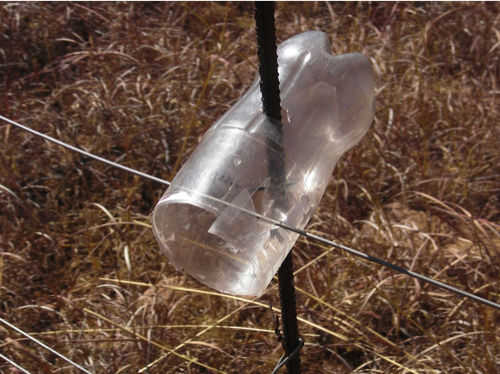Ahora, la marca cerrada, una hendidura o agujero grande por tu post que recorren ambos lados de la botella. Cerca de la ranura, hacer dos pequeños agujeros, cada lado de la raja el post. Utilice este extremo para alambre al poste y correr la cerca eléctrica a través de la ranura de la Z.