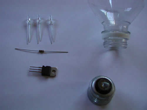 La soldadura de sus LEDs juntos, positivas a negativa. Suelde la resistencia hasta el final negativo. Los extremos de esta matriz a los respectivos cables del regulador de voltaje de la soldadura. En el lado de la entrada para el regulador de tensión, soldar el positivo a la punta de la base de la bombilla. El negativo va al lado del tornillo en la parte de la bombilla. Pegar la botella de plástico en la base.