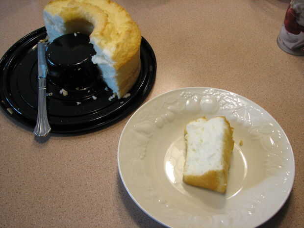 Cortar una rebanada de pastel de Ángel un lugar en un recipiente.