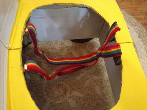 Lo primero que hice fue pegamento caliente parte inferior de la caja juntos así que no necesita embalaje cinta a permanecer juntos. A continuación había escondido las cuatro solapas superiores en y caliente había pegado a las paredes internas de la caja. Esto añade cierta integridad estructural. Utilice un rotulador para dibujar un óvalo en la parte superior grande lo suficiente para que el coche se ajusta cómodamente alrededor de la cintura de los niños. Utilizar el desecho del óvalo para crear el parabrisas. Una vez wis completa y seca (pegamento caliente se seca rápido) que tomó fuera de darle dos capas completos de aerosol en la cartilla. Ir a jugar algunos Skyrim mientras que seca. Tal vez sobre una hora o así. Después del secado, le di un rápido una vez con el papel de lija, lijar suavemente. Le dio un rápido manguera hacia abajo con el compresor de aire para bajar el polvo y he aplicado la primera capa de la pintura acrílica amarilla. Asegurándose de dejar el parabrisas blanco con apenas un marco de aproximadamente 1 pulgada del amarillo. Esperar unos 30 minutos entre capa y capa.