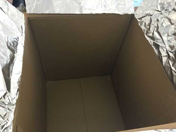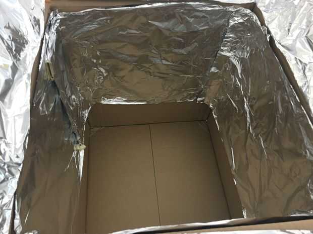 Si la caja #2 tenía un montón de cartón al descubierto, es mejor añadir aluminio a él. No en la parte inferior de la caja - porque le enviará el calor fuera de la caja - pero en los lados. Como se puede ver arriba, las aletas son cebada visible, pero todavía hay mucho espacio que no cubriendo la caja #1. Esto dispersa el calor en lugar de centrado, causando una pérdida de calor.