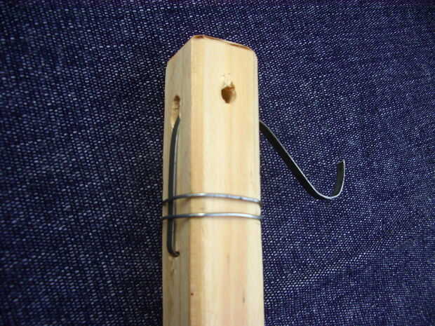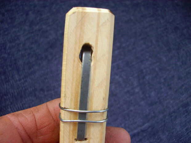 En un extremo del palito hice transversalmente un agujero del diámetro del electrodo más grueso suelo usar, incluida la cobertura (4.5 mm). Enladrillada un agujero de este, sobre una de las de o mar caras adyacentes del palito, hice otro agujero un poco más grande (6 mm), con el centro desplazado unos dos milímetros hacia el extremo más alejado, de manera interceptara parcialmente el primer agujero.