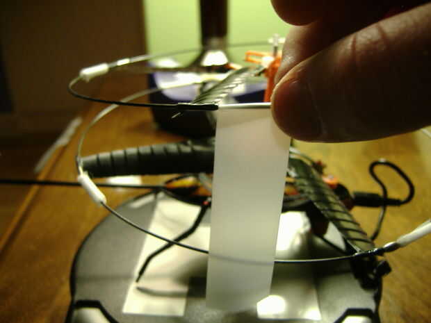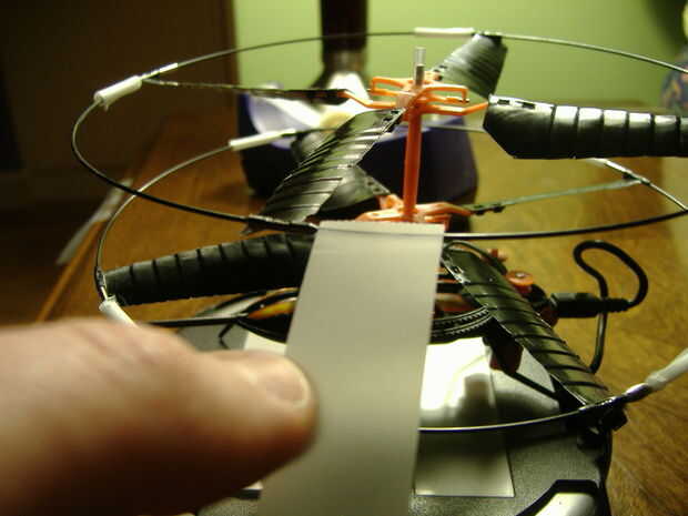 Recoger un trozo de cinta y pega el extremo del cable que se enrolla alrededor de las palas de la hélice. Para asegurarse de que cada pieza de cinta está en el mismo lugar en todos los lados de la hélice que debe poner la cinta al lado de una hoja (ya sea en la derecha o la izquierda no importa, pero que usted elija le debe hacer eso con todas las piezas de la cinta). Envuelva la cinta alrededor del cable con mucho cuidado, porque no quieren la cinta a ser arrugada o podría afectar la manera que la hélice gira. Hacerlo con el resto de la cinta hasta que cada propulsor tiene cuatro pedazos de cinta.