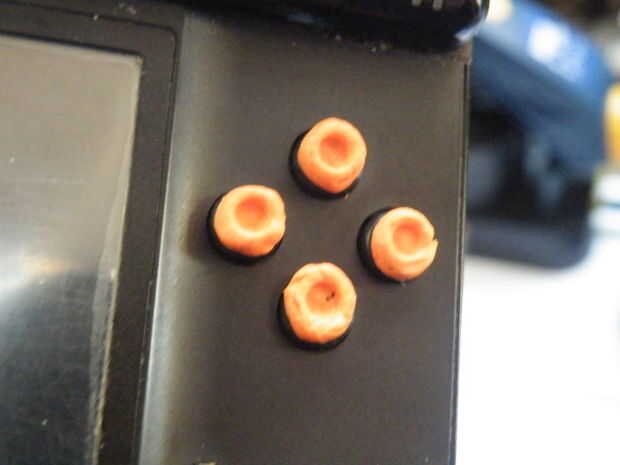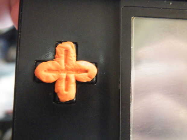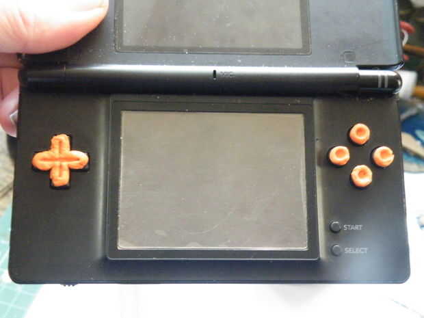 Había rascado la superficie de los botones con la cosa de la amoladora y pequeñas manchas de sugru ha añadido a los botones de dirección, para parar el dedo pulgar de mi abuelita deslizamiento. Usé el borde de un destornillador plano para hacer ranuras en ellos.