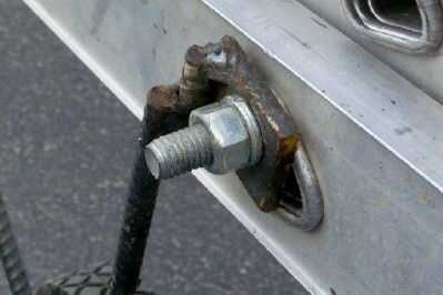 Aviso que soldó con autógena un pedazo corto de la barra de refuerzo a un lado de cada cuadrado y soldar las piezas de barra de refuerzo que forman las piernas del triángulo a los espaciadores. Los separadores son para dar un paso sobre cualquier labio sobre los rieles de escalera.