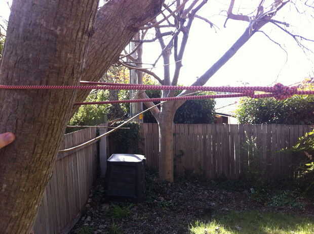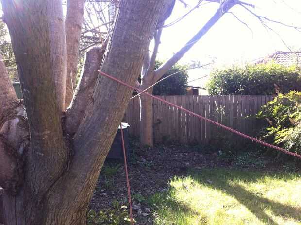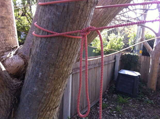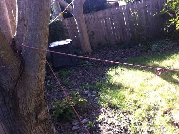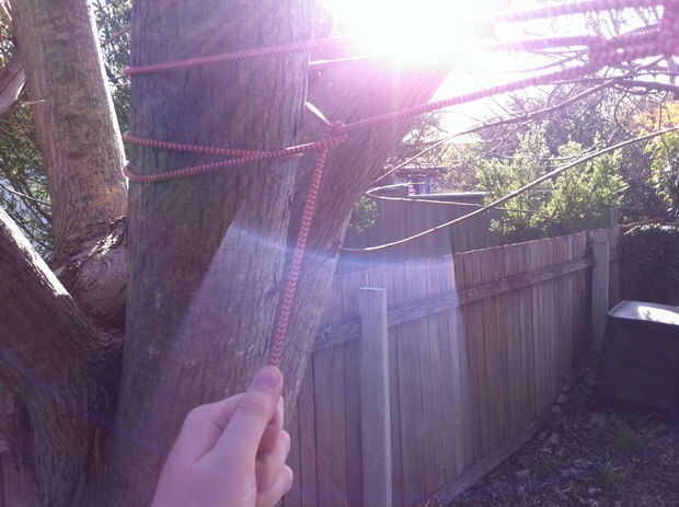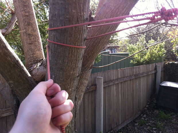 * Mantener la tensión en el extremo, envuélvalo alrededor del árbol otra vez. Esto es cómo mantenemos la tensión terminando el sistema, hay un montón de fricción en esa ronda vuelta significa que no resbale.