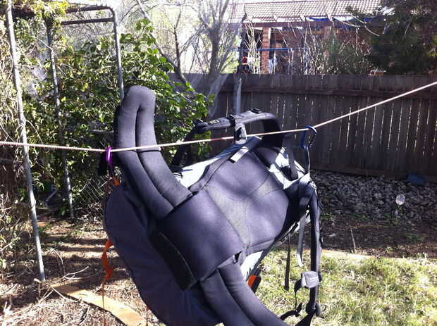 Si te estás preguntando sobre la correa de la cintura, toque la parte superior de la lona pero debe permanecer seco. Ya que hay tanto peso en la línea de canto muy bajo cuelga debajo de la lona cuando su significado tenso que cosas no demasiado húmedo. En esta foto mi paquete sigue teniendo mi saco de dormir y hamaca y todo mi equipo y que todavía no cuelgue este baja.