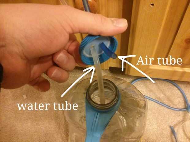 Agregue el agua y eso es todo! la presión de la bomba de aire se presurice la jarra y si el nivel del agua cae en el acuario, se abre la válvula de flotador. Esto permite que el agua deje la jarra y lenta en el tanque.