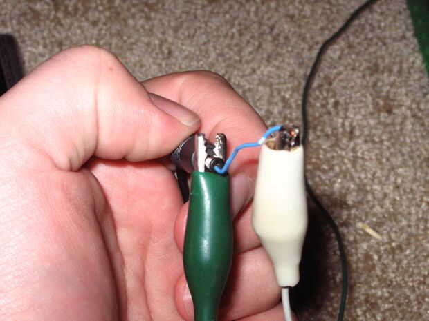 Utilizo un pequeño trozo de cable con un extremo doblado para meter en el agujero del centro, que forma que puedo clip hilos ambas conexiones en el enchufe del transformador.