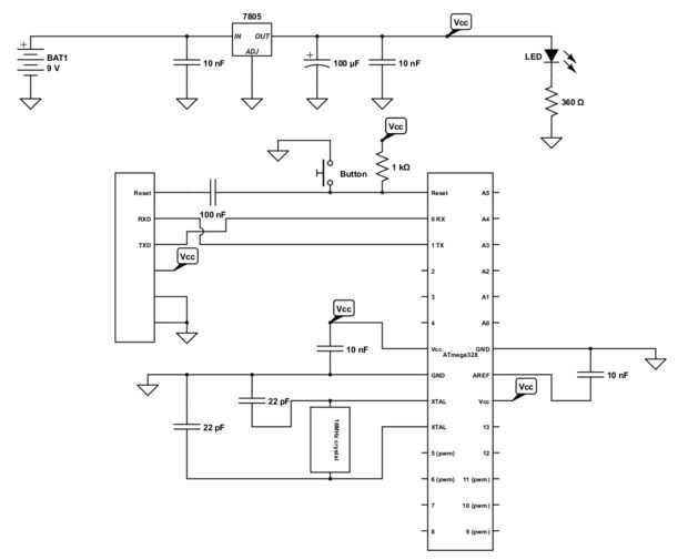 Utilizar este esquema de comprobación y solución de problemas de su trabajo. Todos los nodos marcados Vcc deben conectarse entre sí y todos marcado GND (símbolo de la flecha hacia abajo) debe conectarse entre sí.
