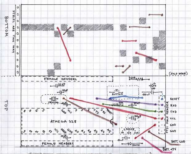 2. también hay una regular electrónica esquemática que muestra todas las conexiones aparte de las cabeceras de pin hembra. Estas cabeceras simplemente se alinean con el controlador y conectan al pin en la misma tira de cobre.