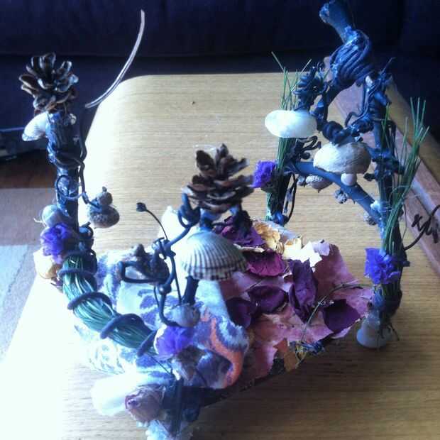 Hice esto con un montón de pegamento caliente :) un viejo roto corona y muchas otras cosas orgánicas encontré en caminatas como piñas pequeñas bellotas, agujas de pino, pétalos de rosas secas, conchas, cuerdas de cuero, básicamente cualquier cosa pude tener en mis manos. deseo que podía dormir en ella!