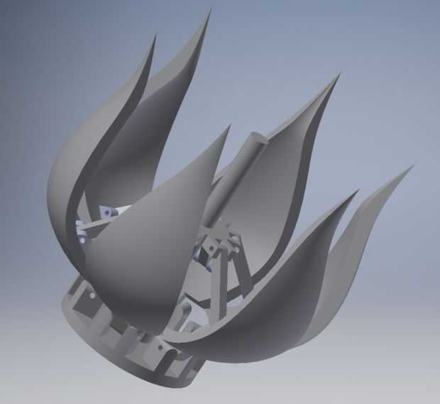 El objetivo del diseño es hacer algo funcional pero interesante para mirar. Por ejemplo, yo quería crear una curva de "tipo cebolla" para los pétalos que se le dará una mirada intimista cuando florece. Las formas y los colores de las piezas de conexión están diseñados para parecer útil como engranaje y mecánica artificial en comparación con el aspecto natural de la flor.
