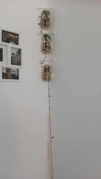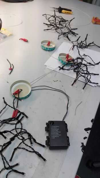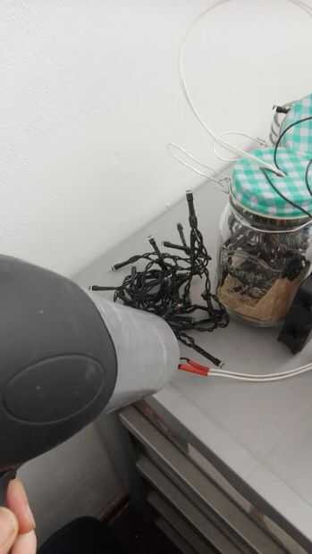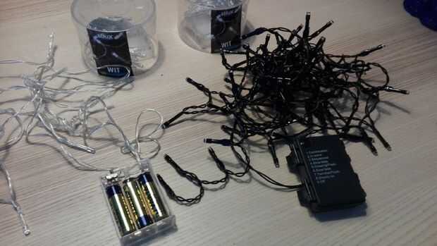 Después de taladrar un gran suficiente hueco en la parte superior de los recipientes de la soldadura puede comenzar. Experimenté con otras luces de hadas, pero manteniendo la batería y el microcontrolador de las luces de Navidad. Quería conservarlos porque tiene 8 programación y se convertirá automáticamente y cada día. También miré que era el positivo y el polo negativo de las luces pero resulta que se pueden conectar ambos sentidos que es bonito. Me cortan la cadena en tres y había conectado con el cable blanco a través de las tapas. No te olvides de colocar los tubos que encoge. Usé mi secador de pelo para los tubos alrededor del cable del encogimiento.