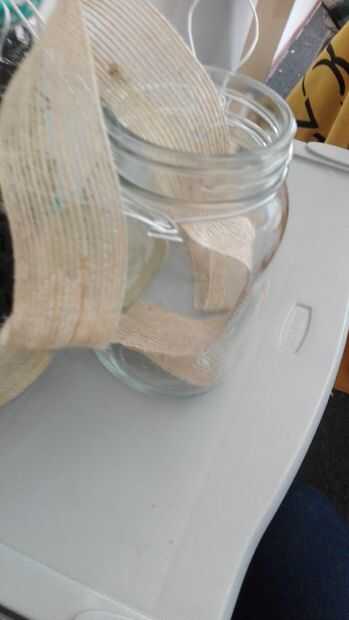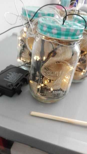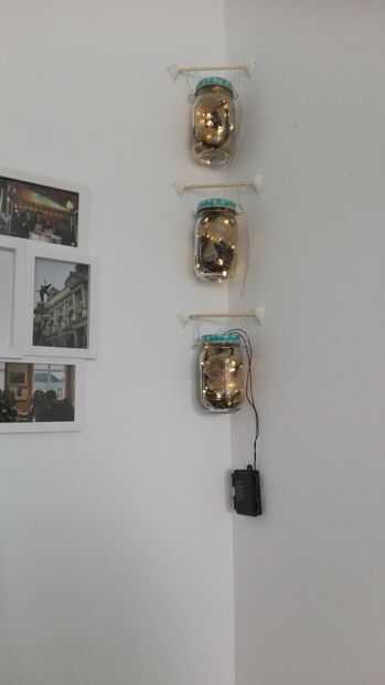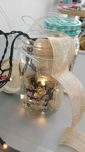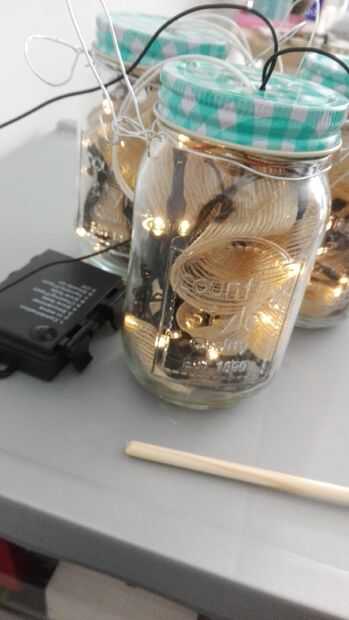 Usando la cinta de arpillera y la prueba de las luces de la capa y dividir la densidad de las luces. Puede utilizar el palo para posicionarlos. Tener en cuenta que la arpillera en sí mismo es inflamable por lo que no se debe colocar las luces a cerca de la arpillera. Pregúntale a un amigo que te ayude a llevar los frascos y las barras y les cuelgo.