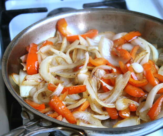 Usted a cocinar las cebollas y pimientos en la misma sartén que la carne en la plancha. Añadir un poco más de aceite si es necesario y calor sobre calor medio alto otra vez.