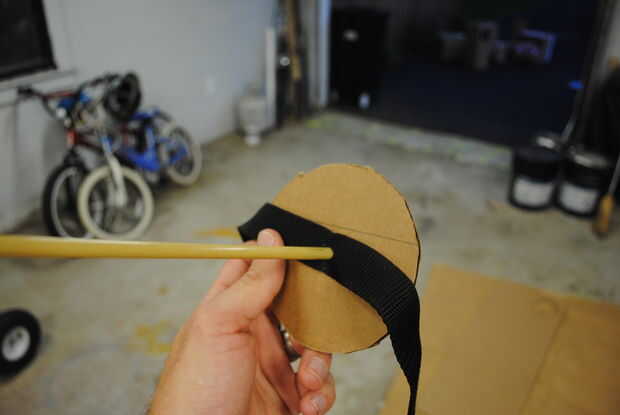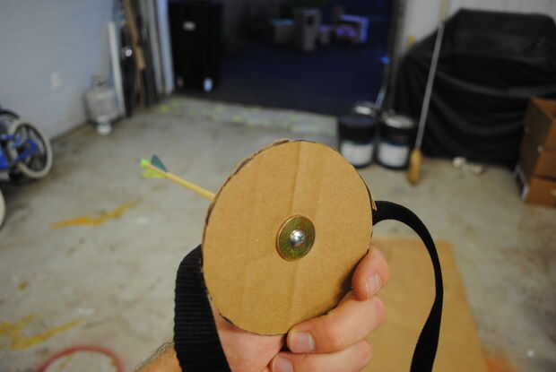 Se necesita un disco de cartón de diámetro más grande entre la correa y la flecha. Esto sirve para mantener la correa de la cincha de simplemente girando bajo el peso de la flecha - manteniendo la flecha perpendicular a tu cuerpo.  Nuestro disco era aproximadamente 5" de diámetro y funcionó bien.