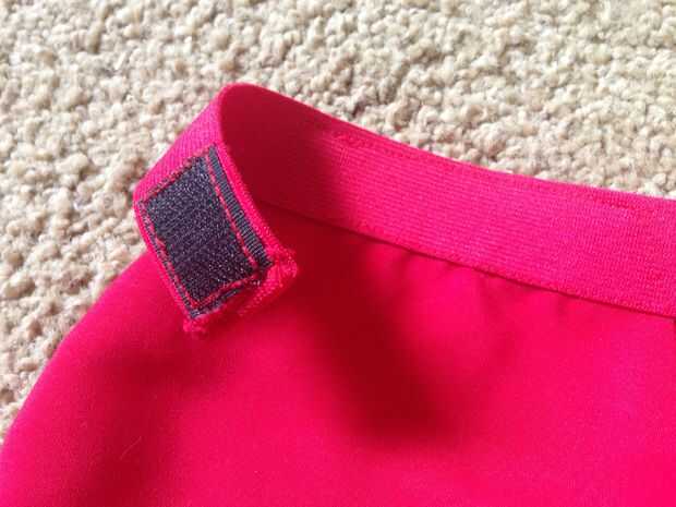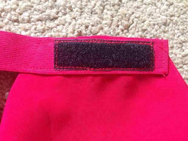 En este punto mide la cintura de mi niño pequeño y añade unos centímetros. Usé un ancho (2 cm) elástico rojo, largo 58 cm. Cosí mujer de velcro de 4 cm en el lado superior y el hombre ancho 2 cm en la parte inferior.