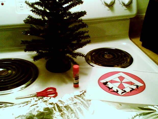 También son necesario: un par de tijeras, un palo de pegamento u otro pegamento, una hoja de papel de aluminio y una impresión de una 'falda de árbol'. Yo tengo la mía fuera de internet, aunque haría cualquier patrón circular. Sólo asegúrese de que es lo suficientemente grande para cubrir la base de su árbol, y eres bueno para ir!