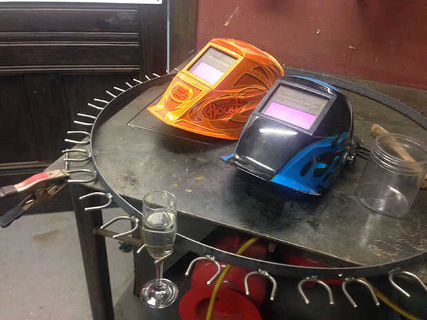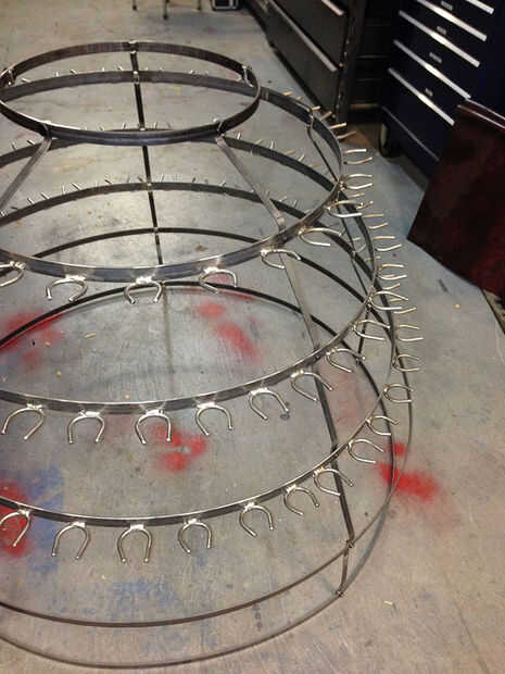 Antes de la soldadura en los ganchos de la flauta es importante hacer los cálculos para los espaciar uniformemente alrededor del perímetro de cada anillo. Para mantener los clientes de tener que agacharse demasiado, decidí sólo tienen flautas el 2 por 4 de aro de la parte superior. Después de marcar los lugares de instalación, cuidando de perder cualquier orificios para los tornillos, es la mesa de soldadura. Las suspensiones para el aro de la soldadura se realiza con el aro hacia abajo. Me sentaba cada anillo espaciador un poco para que la pieza a soldar se elevó ligeramente mientras que las puntas se sentaron en la mesa. Cuando volcó, los soportes de la flauta se inclina ligeramente hasta para ayudar a retener la flauta.