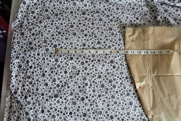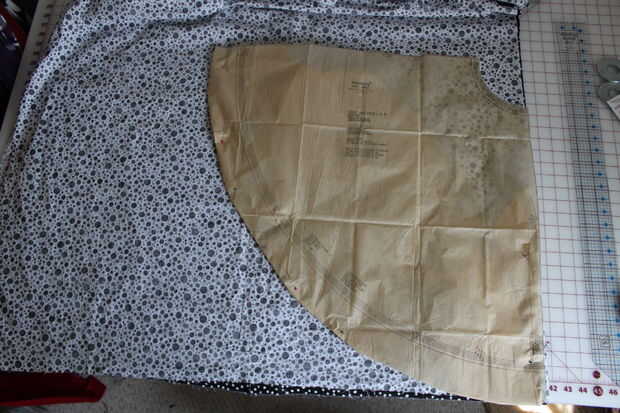 Paso 3- lugar de patrón en la tela para que el lado que dice "lugar de doblez o pliegue de centro" está alineado a la derecha. Esto será el centro de la falda.