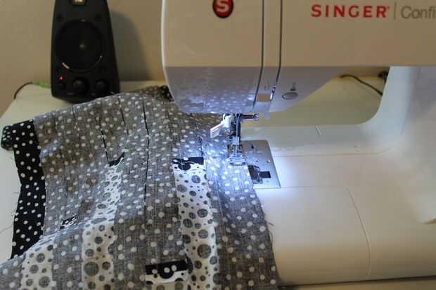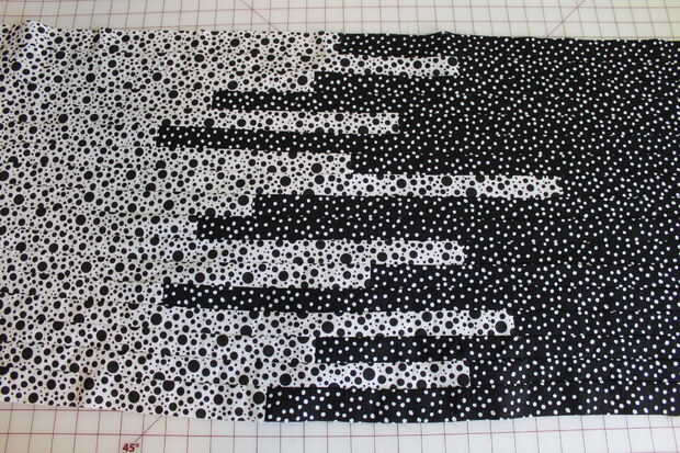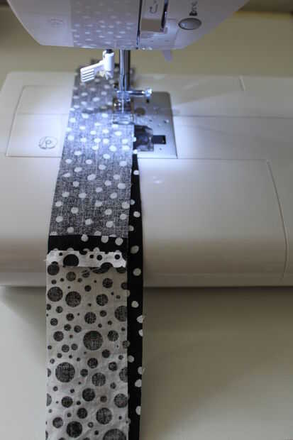 Paso 2- comenzando en un extremo, comenzar cosiendo las tiras juntos. Me gustaría trabajar en secciones; coser las tiras de 5-10 juntos, luego incorporarse a las secciones más adelante. Pulse también como ir. Desea que sus costuras para descender hacia el dobladillo.