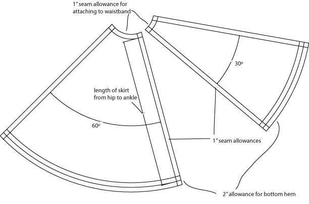 Para hacer el patrón que usará para cortar los paneles individuales, primero agregue líneas de sus márgenes en un panel de dibujo círculo completo. Añadir un círculo con un radio de 1" menos que el círculo interior de la costura de la cintura y un círculo con un radio de 1" más de su círculo exterior para el dobladillo Costura subsidio. Luego añadir las líneas paralelas a las fronteras straight-line de un panel, compensar el panel exterior de 1". A todas las líneas de fuera de estos márgenes y se lo dejaste con un patrón completo de uno de los paneles.