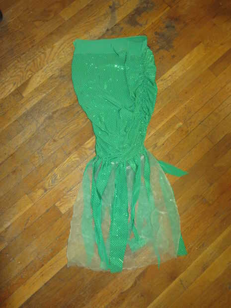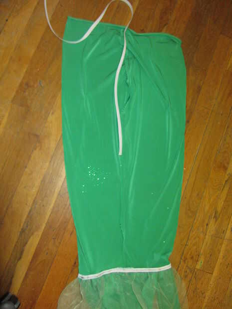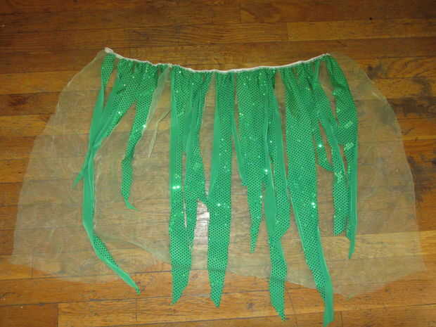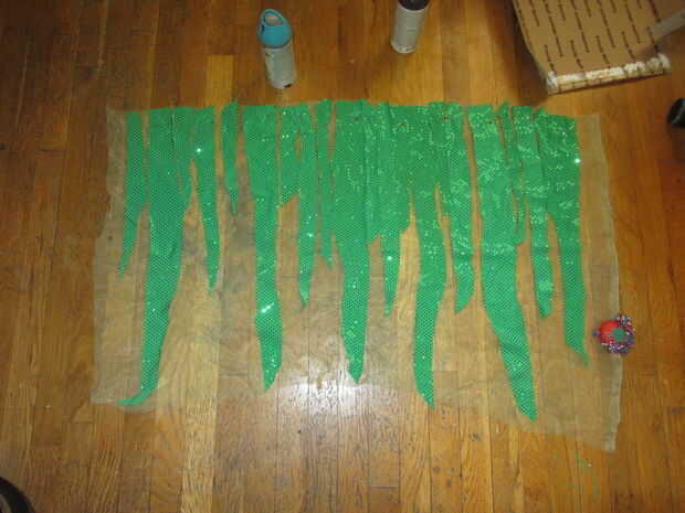 He cortado un montón de pequeñas tiras de tela brillante y había clavado en la parte superior de una longitud de tul verde claro.