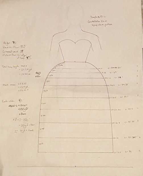 Para lograr la forma de la constelación-mundo, necesitaba una falda del aro de apoyo. El Instructable "como proyecto un Custom aro falda patrón con la exacta forma desea" era extremadamente servicial (¡ gracias TheLacedAngel_TSMP!). Después, yo redacté una falda de aro completa. Más tarde durante la Asamblea decidía 5 aros fue suficiente para que la forma que quería, en vez de 9 redactó.