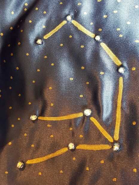Antes de pegar en las luces, decidir cómo quieres decorar a tu tela. Usé un marcador pintura oro para dibujar las líneas de constelación y estrellas de fondo en la falda. Es mucho más fácil mientras que la falda sigue siendo totalmente plana!