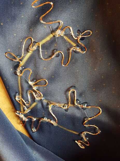 La tela es amorfa, por lo que es importante incluir el alivio de tensión para evitar que los cables de romper como la tela se mueve. Encontré que funcionaba bien para doblar las hebras de luz de hadas en un serpentín antes caliente les pega a la tela. Probar esto en una pieza de prueba para asegurarse de que el pegamento caliente pega bien a la tela, sin sacar ni de fusión lo!