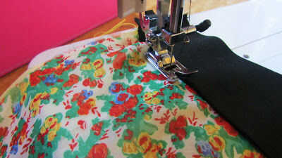 2. Después de bloquear las primera algunas puntadas (se cose hacia adelante y hacia atrás) tirón del elástico como coser
