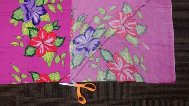 Cortar 2 tiras de 45" tela-27" largo cada una. Coloque derecho lados juntos y coser las costuras laterales. Quise usar el flequillo que estaba en los extremos cortos de pareo, por lo que arregló para que la franja está en la parte inferior de la falda terminada.