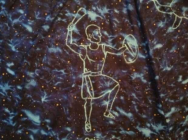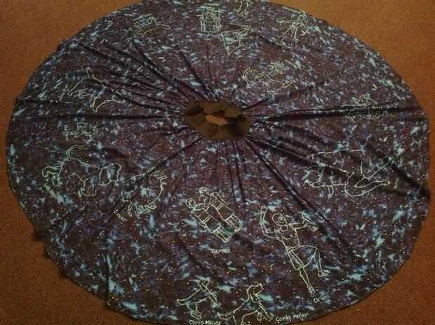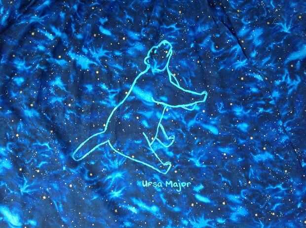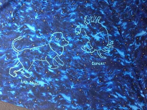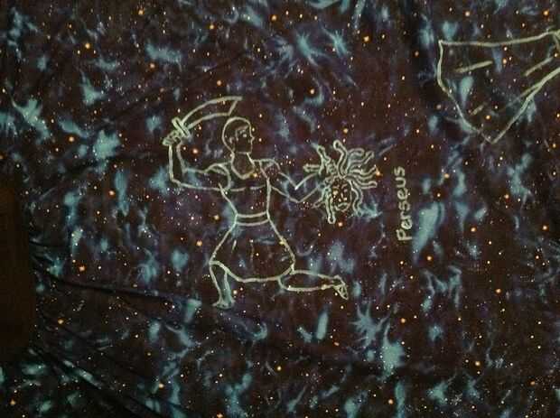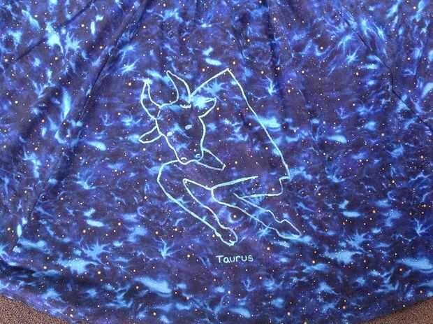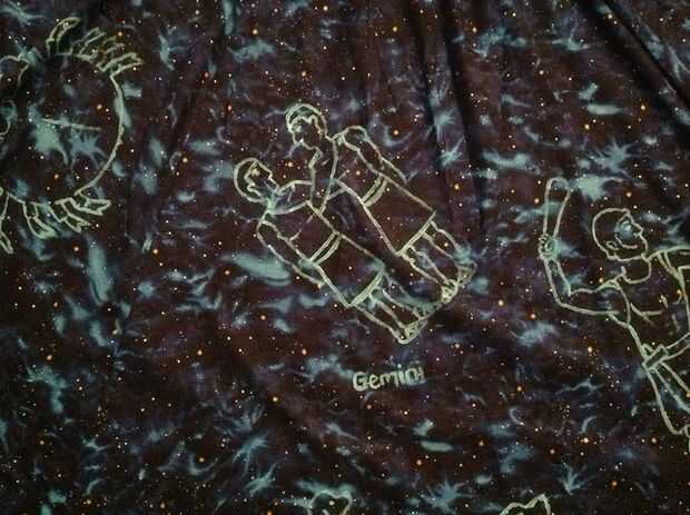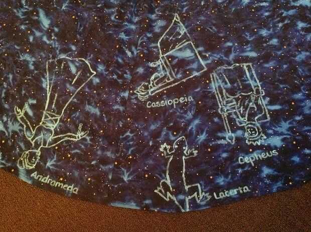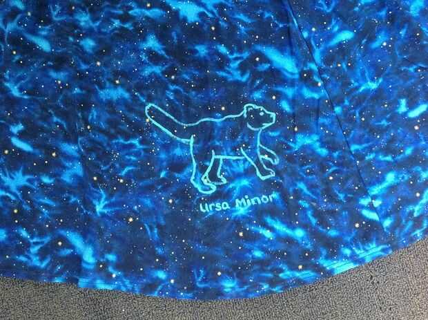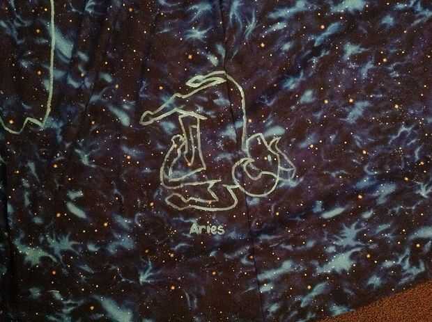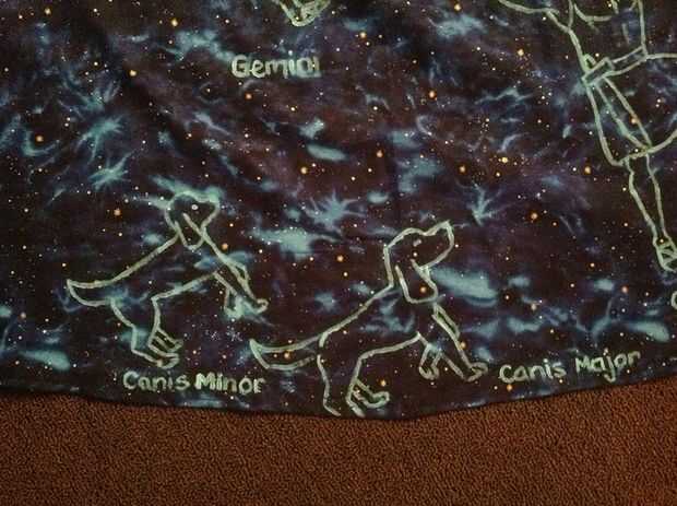 Usar alguna pintura de tela y un pincel de pintura de tela, extensión mi falda en el suelo, poner un papel debajo para que la pintura no vaya a través a mi alfombra y comenzó libre-dar cuidadosamente las imágenes de la constelación. Perdónenme la variación de color - pintaba en mi porche de pantalla y la puesta del sol, por lo que los primeros son durante el día y el último bajo un reflector.
