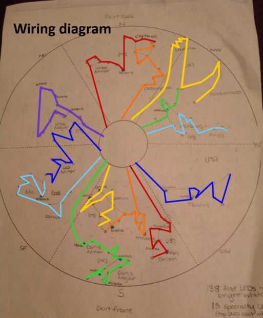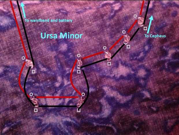 pedí plano super brillante 5mm LEDs online para acerca de $0,07 cada, conseguir el doble como lo usaría en la falda - así, podía sustituir mal construidas, los dim o los rompí en todo este proceso. Utilizando pinzas de joyeros, hice los cables positivos en formas planas "o" y los cables negativos en cuadrados. Haciendo así que permítanme tratar los LEDs como perlas o lentejuelas para que yo pude coserlas en la falda fácilmente. También significaba que estaba ahorrando ya que pagaría ese precio por lo menos tres veces para lentejuelas de LED. Bosquejó lo quería el cableado para ir y cosido en los LEDs para que sería relativamente fácil de hacer después de la soldadura. Lo planeado en el 11-13 LED con cable paralelo para cada circuito. Los 13 circuitos luego se funcionaría en paralelo con los demás. El diagrama de cableado para Osa menor muestra las formas de los plomos. He añadido los círculos y cuadrados, esa imagen ya que no todos los conductores están claros en la imagen.