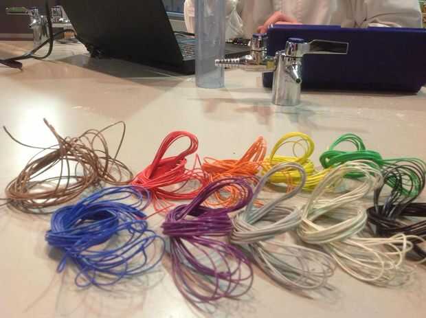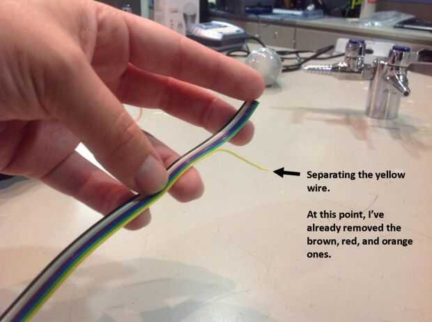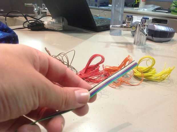 Compré un cable de cinta de 15 pies del arco iris en línea y separados en sus diez colores individuales. Si nunca has hecho esto antes, la parte más difícil es mantenerlos aseados y ordenados una vez separadas. Ponga su miniatura en la ranura entre dos colores de los cables y lentamente tire del cable en el extremo lejos del resto del cable de cinta. Opté por usar colores cálidos color de negativa, la positiva y fresca con las mismas parejas de color para crear circuitos, como rojo y gris o naranja y azul, que haría de cableado que mucho más fácil (y mi TOC mucho más feliz).