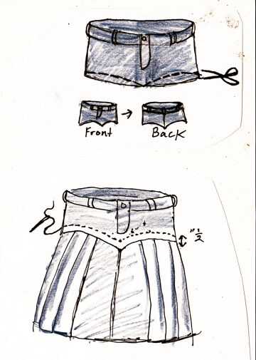 Sacar otra vez la parte superior del jean. Corte de 2 pulgadas debajo de los bolsillos (macro minifalda!). Ahora traza había arqueada línea de los lados a la mitad, luego otra de la mitad hacia el otro lado. Do la parte posterior de la misma manera.  Ahora Alinee la falda con la parte superior de los pantalones vaqueros. PIN y coser, dejando un margen de costura de media pulgada. Doble bajo borde expuesto y coser con hilo de jeans.