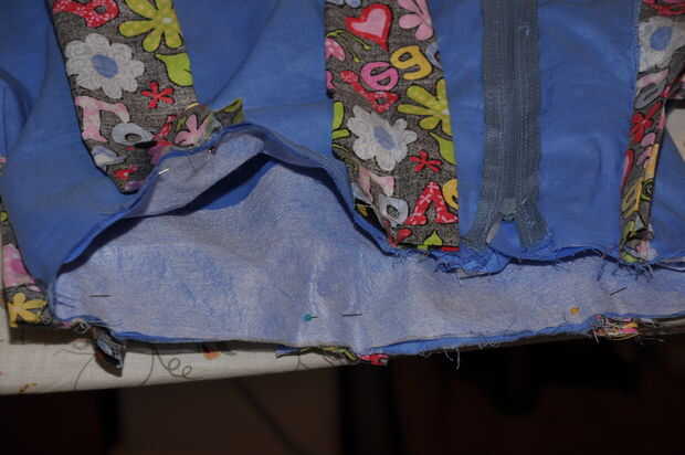 2) comenzando en el lado izquierdo de la cremallera, dejar margen de costura de ½" y pin la pretina a la falda, lados derecho juntos.
